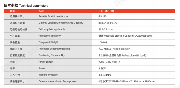 DTHM7000 雙臺面配退針機適用于鉆針房取代傳統的手工作業,可對中0.1mm 至中6.5mm 范圍內的鉆頭實現鉆針的信息綁定、自動 配針、自動退針等工序。雙工作臺面可保證不停機換料,提升作業效益,可兼容多批次多型號的配針作業。